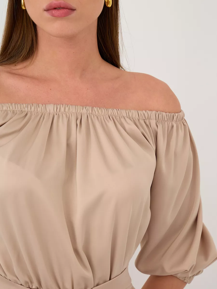 Очаровательное изделие в романтическом стиле можно носить в двух вариантах, с открытыми и закрытыми плечами. Вырез горловины, нижние части рукава-реглан и по окружности талии - платье собрано на эластичную резинку.